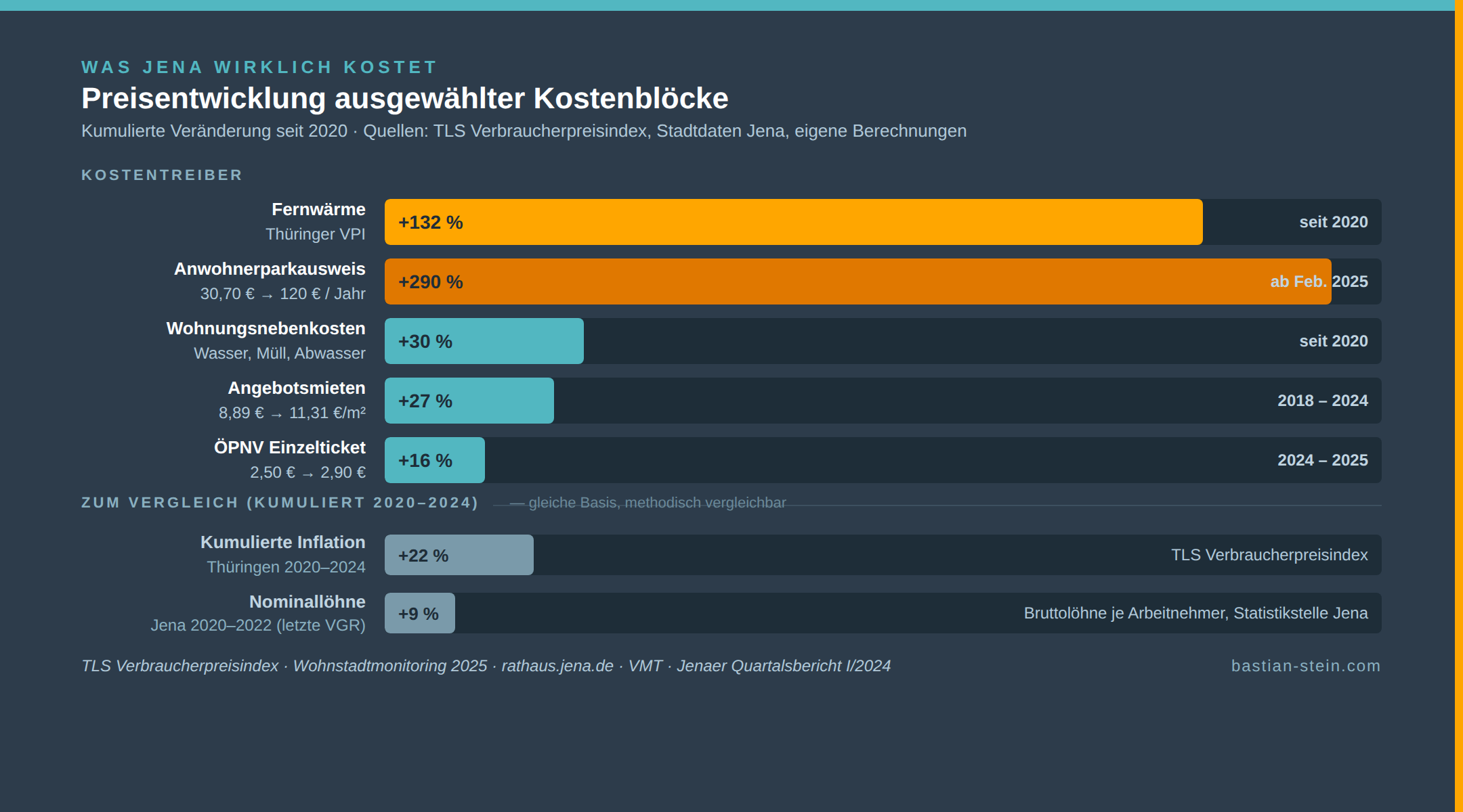 Quellen: Wohnstadtmonitoring 2025 (Stadt Jena/Timourou); Beantwortung CDU Große Anfrage zur wirtschaftlichen Lage (März 2026); Jenaer Statistik Quartalsbericht II/2025; Prognos Zukunftsatlas 2025; Thüringer Landesamt für Statistik (Reallöhne 2024); rathaus.jena.de (Grundsteuerreform, Parkgebühren); Stadtwerke Energie Jena-Pößneck (öffentliche Tarife); Kita-Bedarfsplan 2025/26 (Stadt Jena); Bundesregierung (Mindestlohn 2026).