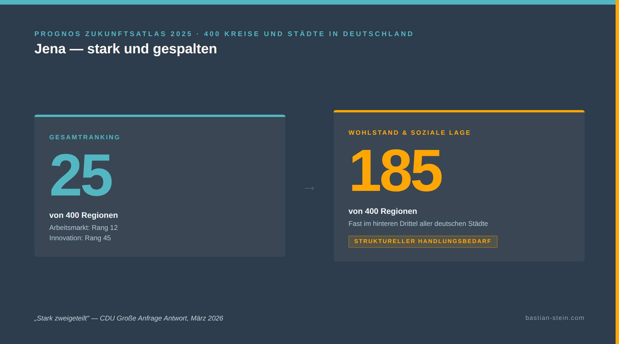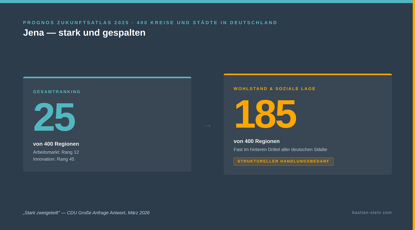 Im Prognos Zukunftsatlas 2025 belegt Jena Rang 25 von 400 deutschen Kreisen und Städten. Das klingt gut. Das ist auch gut. Arbeitsmarkt: Rang 12. Wettbewerb und Innovation: Rang 45. Jena ist eine Erfolgsgeschichte — und ich sage das ohne Ironie. Aber dann ist da noch eine andere Zahl: Rang 185 bei Wohlstand und sozialer Lage.