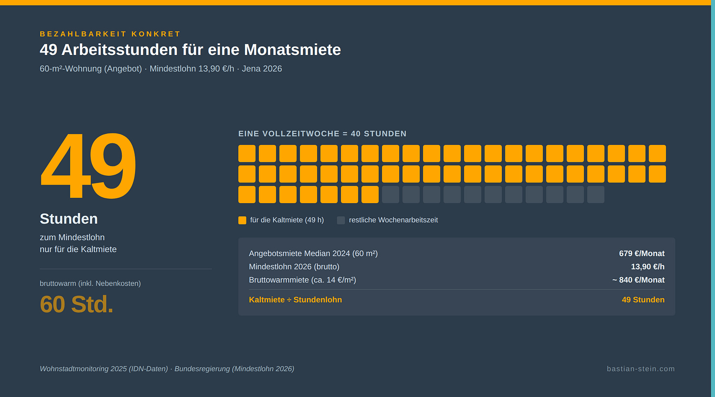 Rechnen wir kurz durch. Eine 60-Quadratmeter-Wohnung auf dem Jenaer Angebotsmarkt kostet heute rund 679 Euro kalt — plus Betriebskosten kommt man auf etwa 840 Euro bruttowarm. Wer zum Mindestlohn arbeitet (seit Januar 2026: 13,90 €/Stunde), muss dafür rechnerisch mehr als 49 Stunden arbeiten — eine komplette Vollzeitwoche. Für die Miete. Noch nicht für Strom, Gas, Kita, Bus. Das trifft diejenigen mit geringem Einkommen und Familien am stärksten — und es ist kein Einzelfall: Laut Bürgerbefragung 2023 wenden bereits 28 Prozent aller Jenaer Haushalte mehr als 30 Prozent ihres Nettoeinkommens für Wohnkosten auf.
