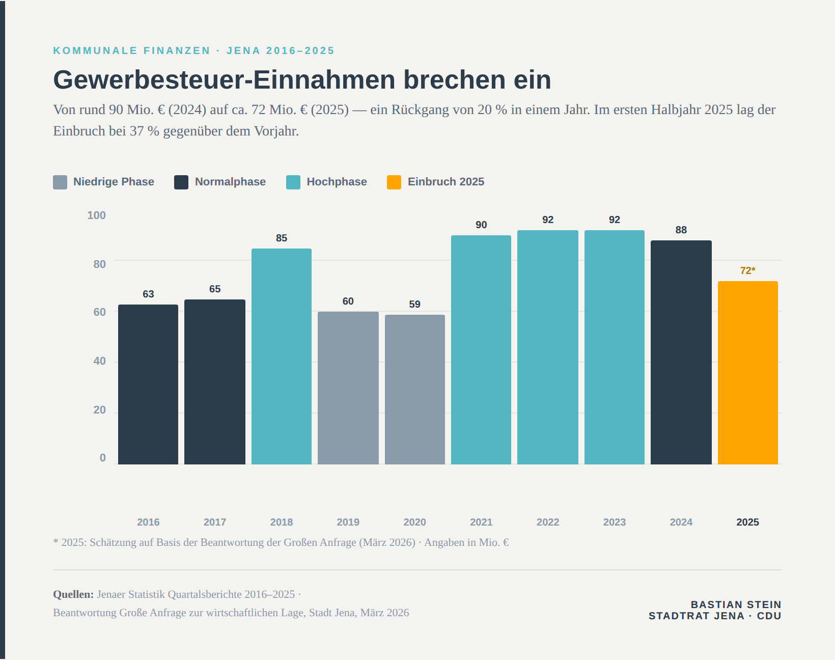 Warum bewegt mich das überhaupt? Die Gewerbesteuer ist von etwa 90 Millionen Euro im Jahr 2024 auf rund 72 Millionen Euro im Jahr 2025 gefallen. Im ersten Halbjahr 2025 lag der Einbruch bei 37 Prozent gegenüber dem Vorjahreswert. Aber diese Zahl ist nicht die Ursache — sie ist die Folge der wirtschaftlichen Entwicklung.