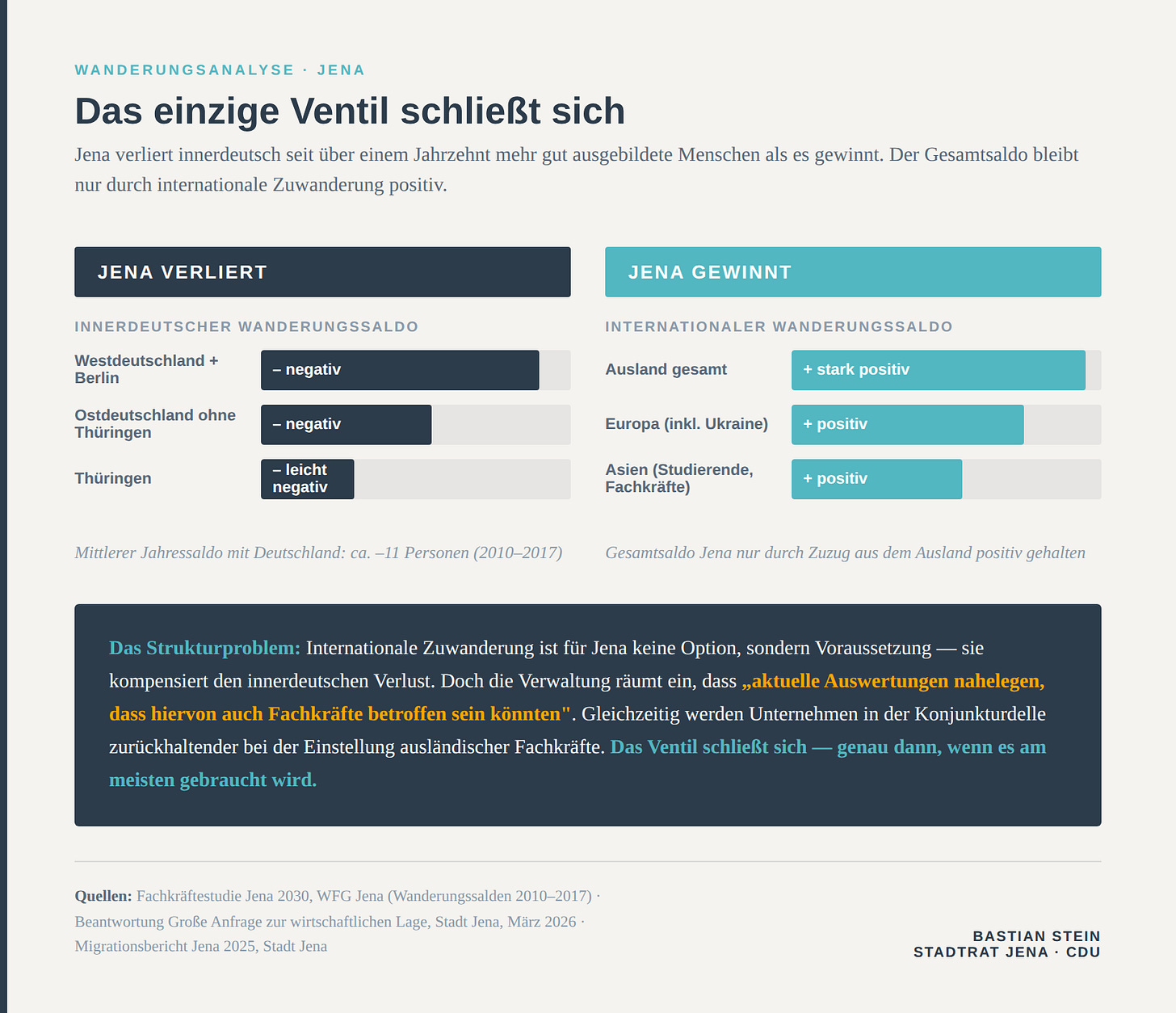 “Die Fachkräftestudie für Jena geht zudem davon aus, dass der Wanderungssaldo zwischen Jena und dem übrigen Bundesgebiet tendenziell negativ bleibt. […] aktuelle Auswertungen legen zudem nahe, dass hiervon auch Fachkräfte betroffen sein könnten .."