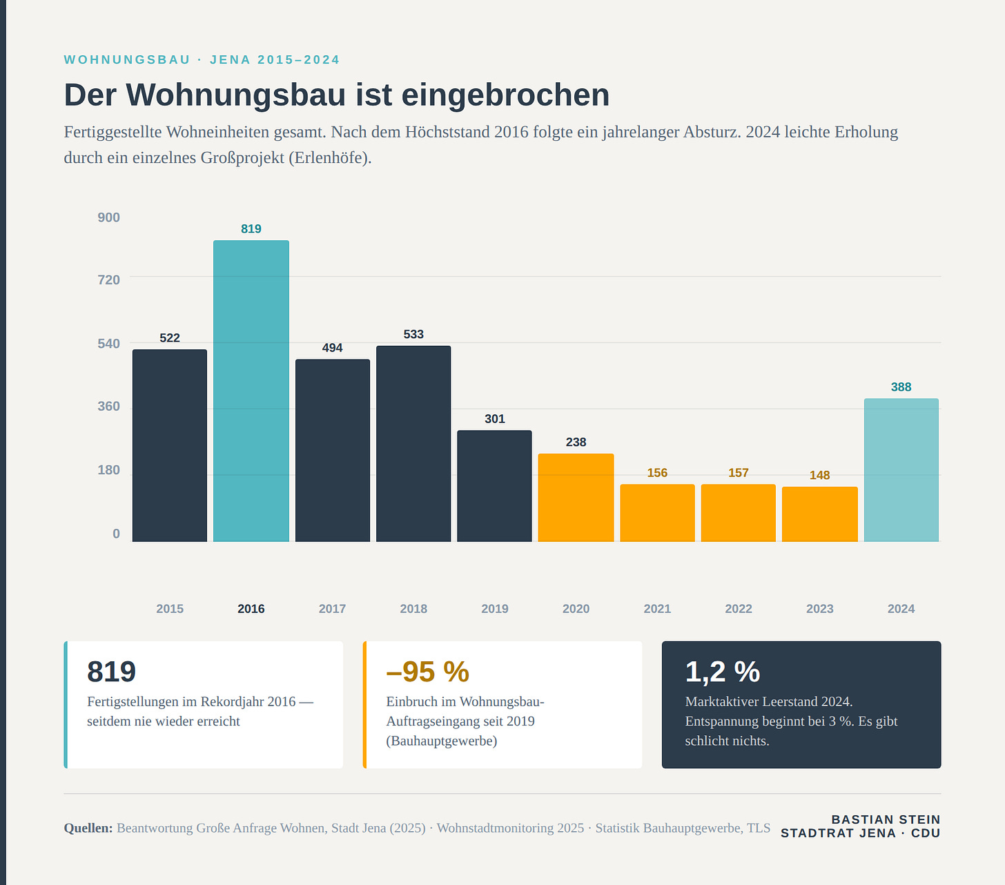 Jena ist strukturell stark*. Das steht auch in der Beantwortung, und es stimmt. Aber strukturelle Stärke ist keine Garantie — sie muss gepflegt werden. Ein Regelwerk, das Bauen verteuert statt ermöglicht, ein Markt ohne Luft, ein Fachkräfteproblem, das man noch analysiert: Das sind keine Naturgewalten. Das sind Entscheidungsfelder.