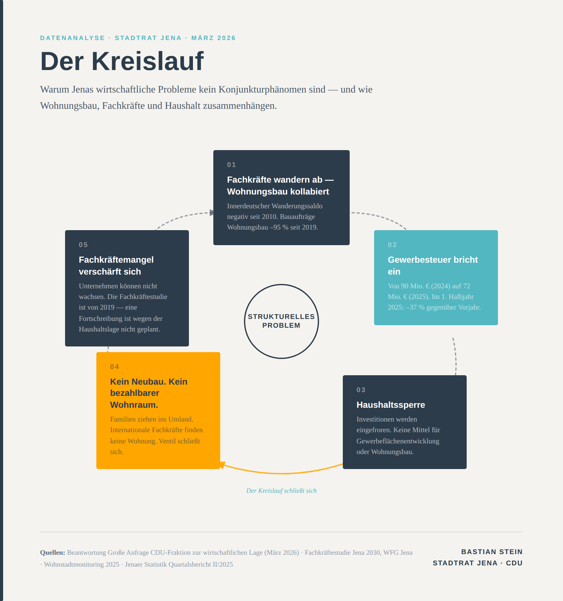 Quellen: Beantwortung Große Anfrage zur wirtschaftlichen Lage (CDU-Fraktion / Stadt Jena, März 2026) · Wohnstadtmonitoring Jena 2025 · Fachkräftestudie Jena 2030, WFG Jena · Beantwortung Große Anfrage Wohnen (Stadt Jena, 2025) · Jenaer Statistik Quartalsbericht II/2025 · Sachverständigenrat Wirtschaft, Jahresgutachten 2024/25