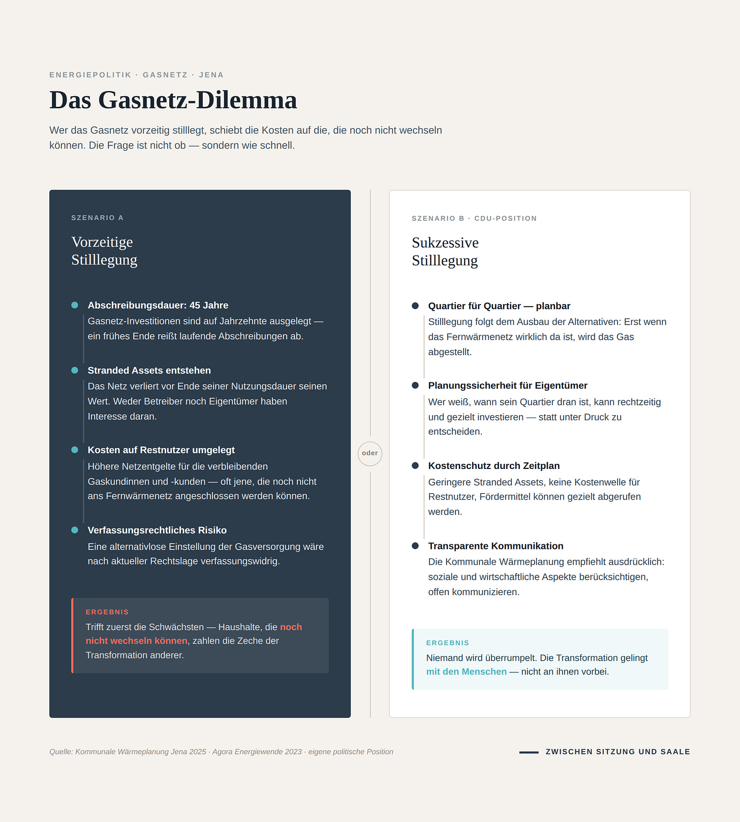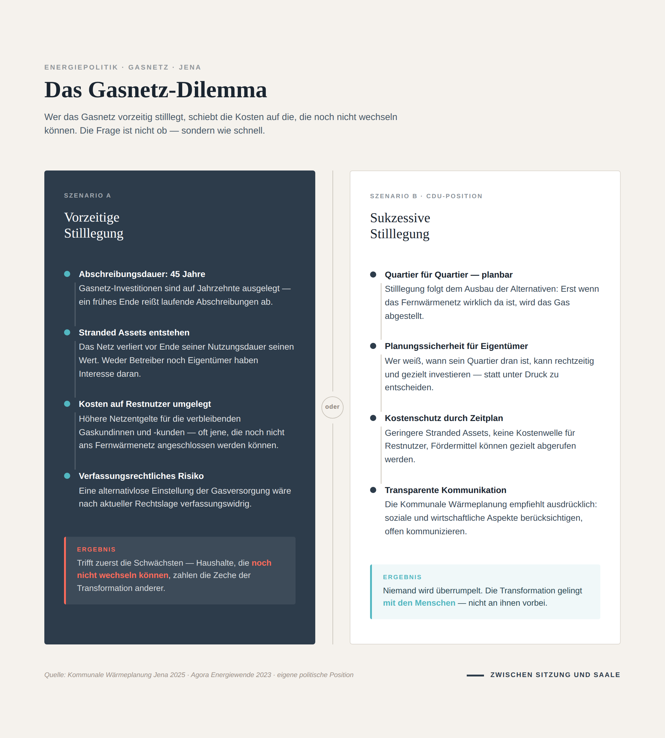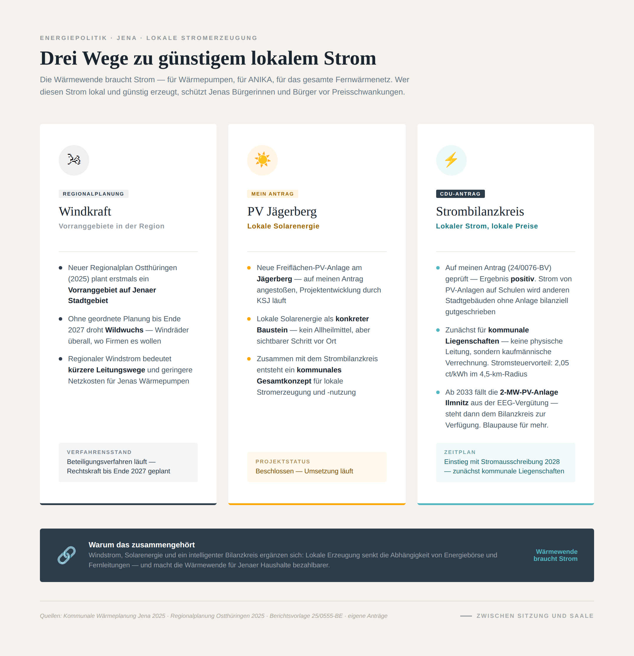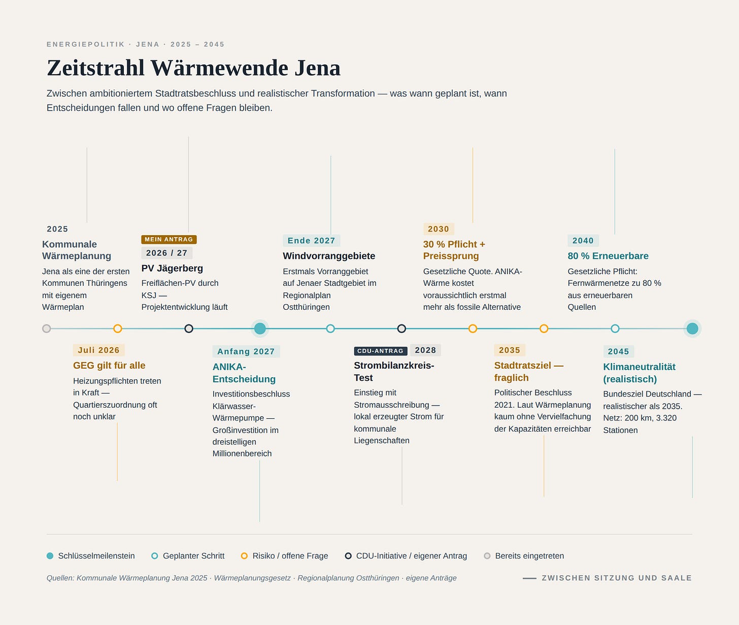 Quellen: Kommunale Wärmeplanung Jena 2025 (verabschiedet Juni 2025), Wärmeplanungsgesetz (WPG), Gebäudeenergiegesetz (GEG), – Regionalplanung Ostthüringen: Sachlicher Teilplan Windenergie, Entwurf Beschluss 04.06.2025, Berichtsvorlage 25/0555-BE: Strombilanzkreis Jena, Agora Energiewende 2023: Erdgasverteilnetze, Eigene Stadtrats-Anträge: 24/0076-BV (Strombilanzkreis), 22/1487-BV (Solar auf dem Jägerberg)