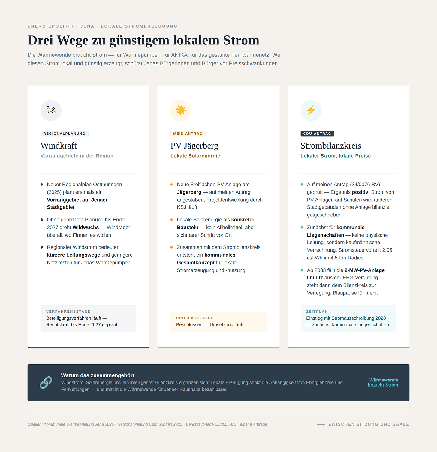 Wir haben bisher nicht über Strom gesprochen. Die Wärmewende braucht Strom — für Wärmepumpen, für ANIKA, für das gesamte Fernwärmenetz. Anders als bei Gas, Kohle und Öl, haben wir bei der Stromerzeugung einige möglichkeiten in Jena. Nicht viele, aber einige. Wer diesen Strom lokal und günstig erzeugt, schützt Jenas Bürger vor Preisschwankungen.