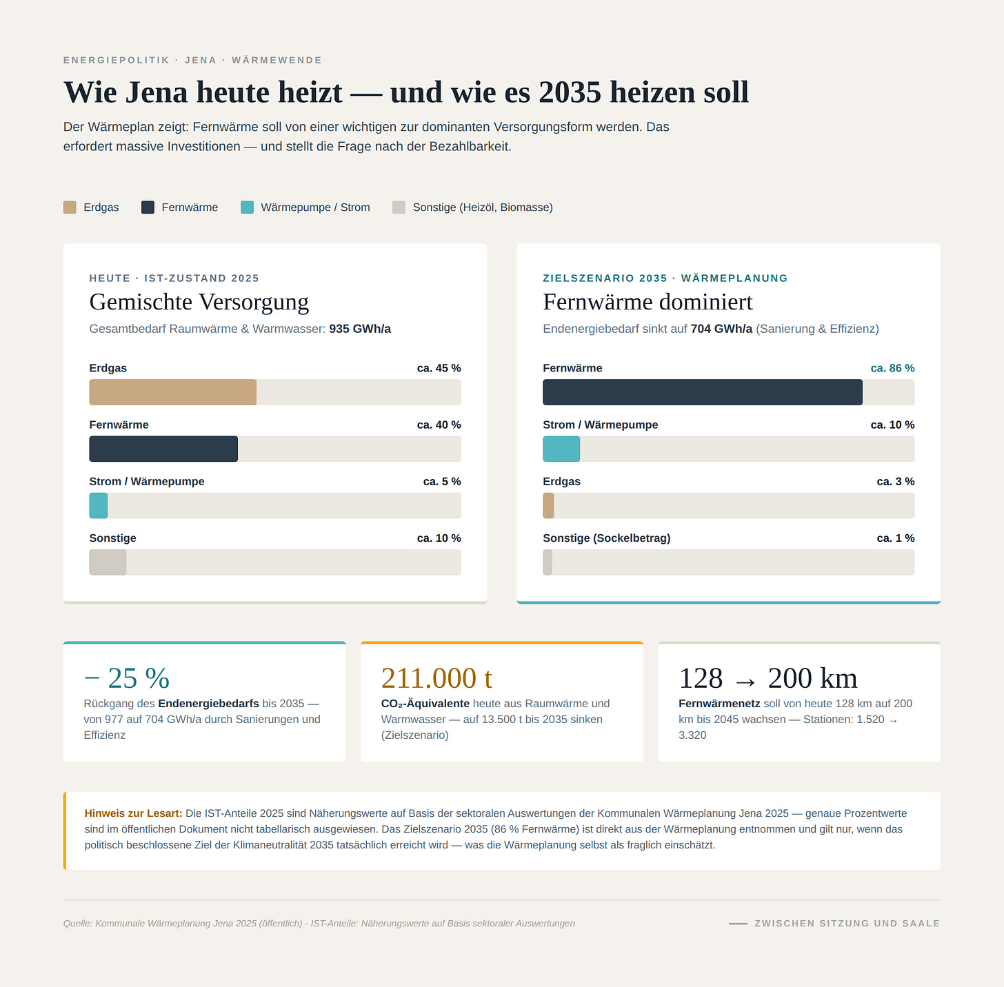 Hier einige Ziele: Jena will bis 2045 das Fernwärmenetz von heute 128 auf 200 Kilometer ausbauen, die Zahl der angeschlossenen Gebäude mehr als verdoppeln und den Anteil der Fernwärme am gesamten Wärmebedarf auf 86 Prozent steigern. Heute verursacht allein die Wärmeversorgung der Stadt 211.000 Tonnen CO₂ pro Jahr. Diese Zahlen zeigen die Dimension — und sie zeigen, warum mit der Wärmeplanung noch keine einzige Entscheidung über Kosten oder Zeitplan gefallen ist.